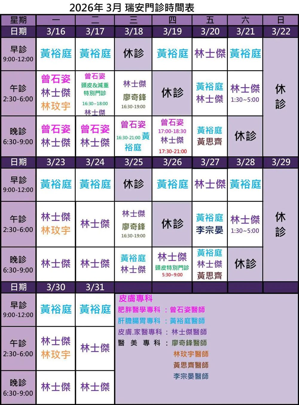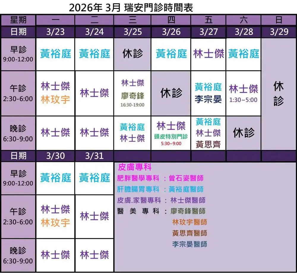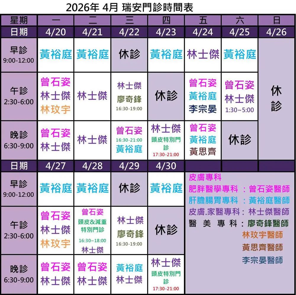 瑞安診所位於台中西屯區中科商圈,提供皮膚科、掉髮治療、減肥門診與醫學美容,以及內科與腸胃科照護服務,是在地專業醫療與醫美整合診所。
