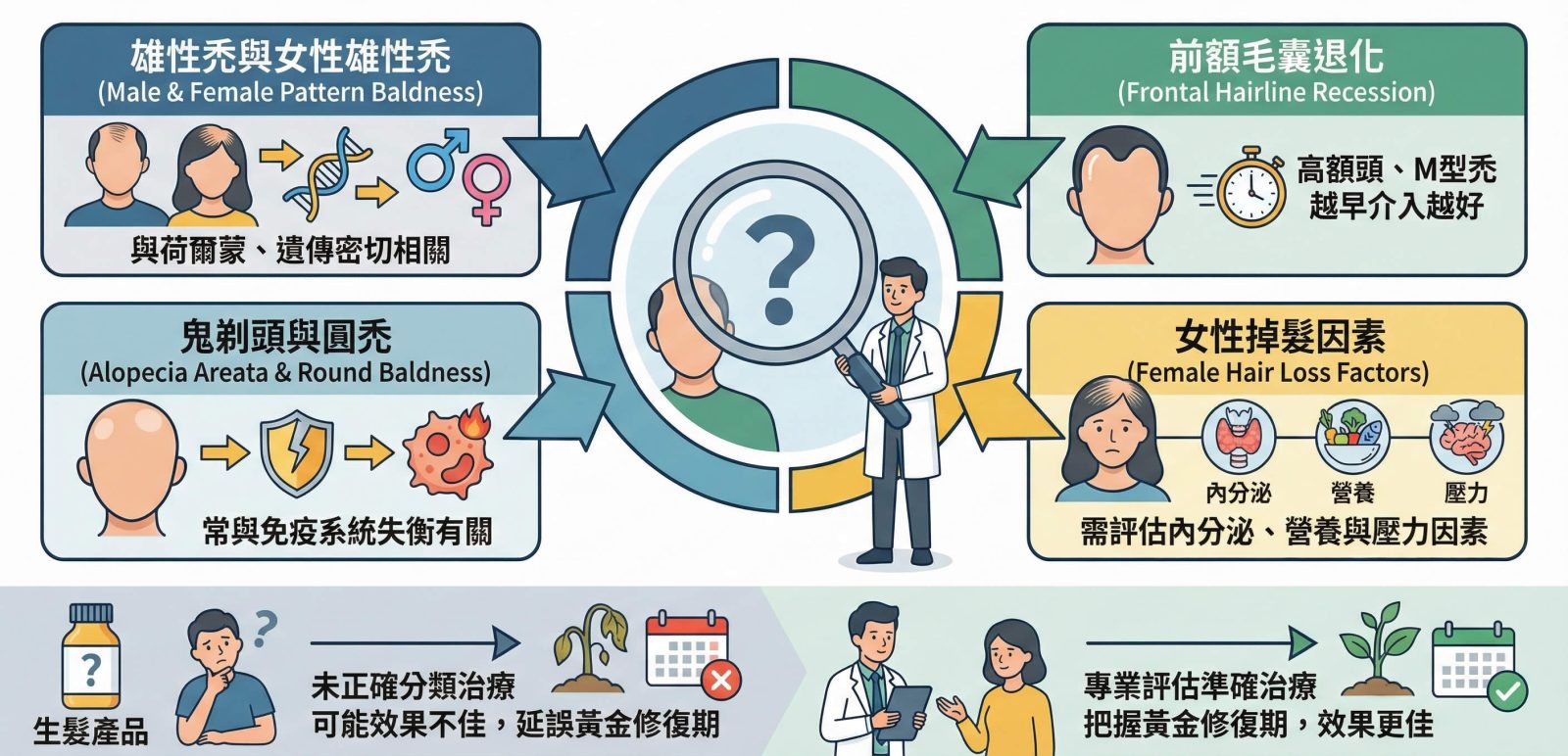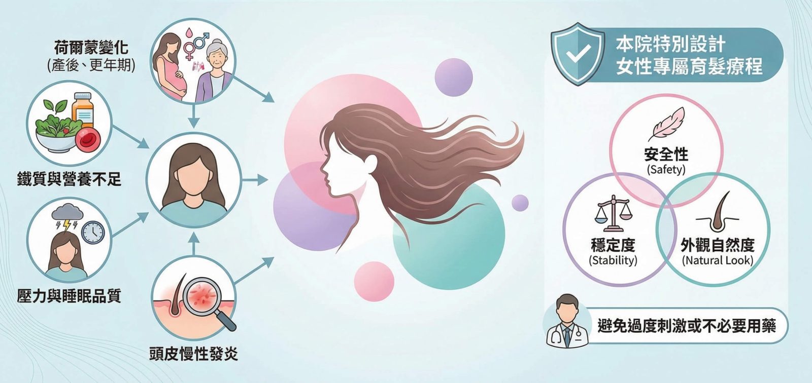 - ✔ 女性掉髮需評估內分泌、營養與壓力因素