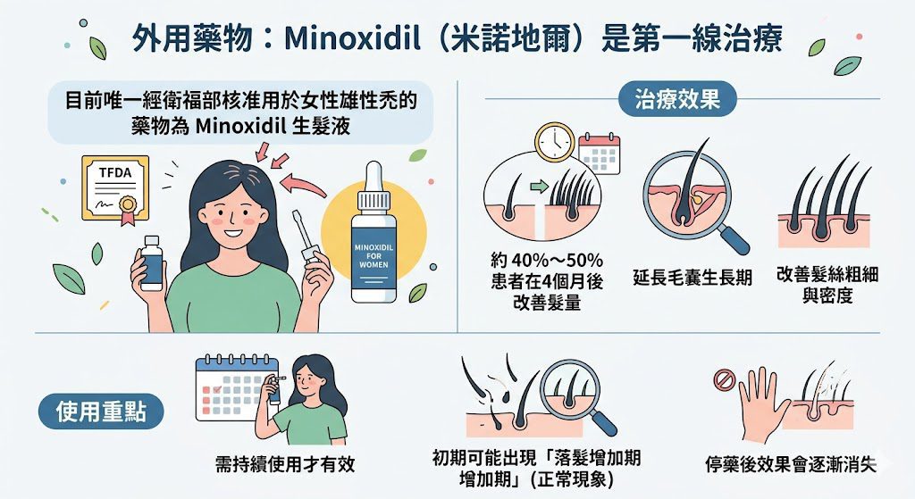 目前唯一經衛福部核准用於女性雄性禿的藥物為 Minoxidil 生髮液。