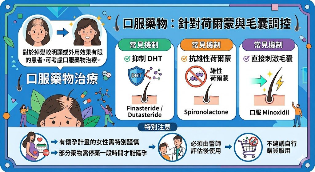 對於掉髮較明顯或外用效果有限的患者,可考慮口服藥物治療。