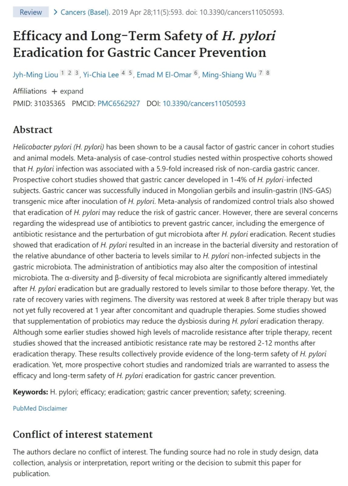 幽門螺旋桿菌(H. pylori)是一種常見的細菌,感染後可引起胃炎、胃潰瘍,甚至胃癌。根據一項發表在《PubMed》的研究顯示,根除幽門螺旋桿菌可以有效預防胃癌,且這種預防效果在長期追蹤中持續存在。