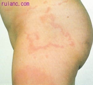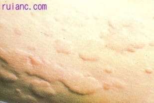 蕁麻疹初起皮膚局部發生瘙癢,抓後皮膚潮紅,迅即發生形狀不一,大小不等鮮紅或白色風團,劇烈瘙癢,此起彼伏,一日之內可發作數次。一般皮疹泛發全身,黏膜部位亦可受累,發生於胃腸道可伴有腹痛、腹瀉,發生於喉頭黏膜,則可引起喉頭水腫產生呼吸困難,胸悶憋氣,嚴重者可窒息死亡。反覆發作者,可遷延數月或數年。