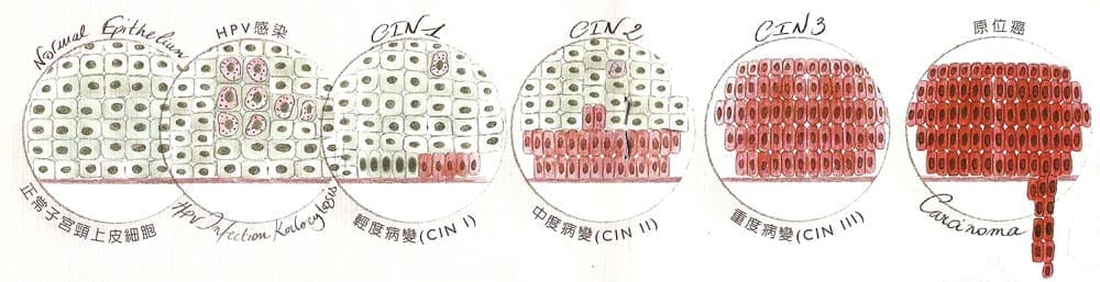 三、 從HPV感染到子宮頸癌的發展過程子宮頸癌前病變還不是癌症,子宮頸上皮細胞受到HPV持續感染後就會從輕度病變(CIN1)、變成中度病變(CIN2)、持續未獲適當治療就會變成重度病變(CIN3)。以往重度病變又稱為子宮頸原位癌或稱為零期子宮頸癌(CIS) 。
