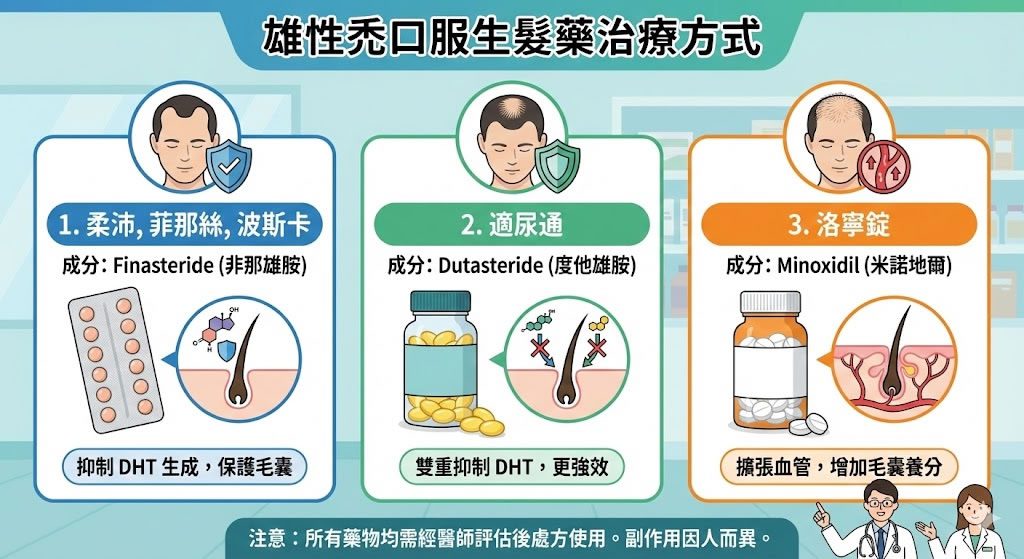 根據不同患者的落髮狀況與體質,以下為常見的雄性禿治療選項: