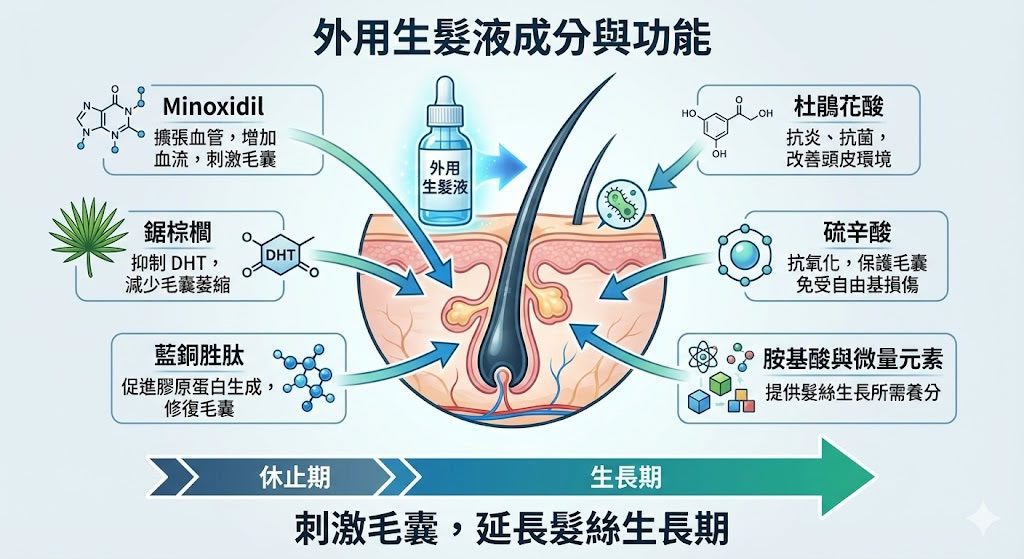 | 外用生髮液(Minoxidil、鋸棕櫚、藍銅胜肽、杜鵑花酸、硫辛酸、胺基酸與微量元素) | 刺激毛囊,延長髮絲生長期 |