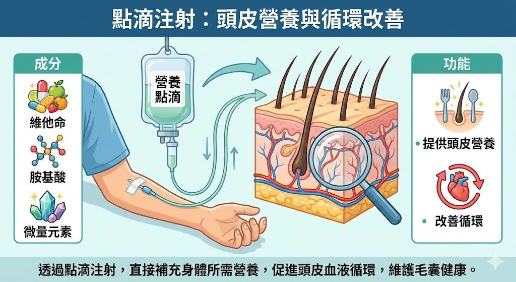 | 維他命、胺基酸、微量元素 | 提供頭皮營養,改善循環 |