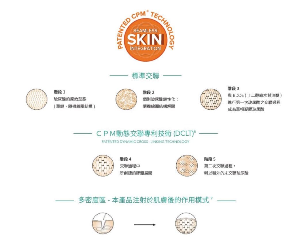 獨家CPM專利技術讓玻尿酸有平衡完美的流變性,多密度結構使玻尿酸與皮膚間組織密切融合,帶來可預期且自然的效果。