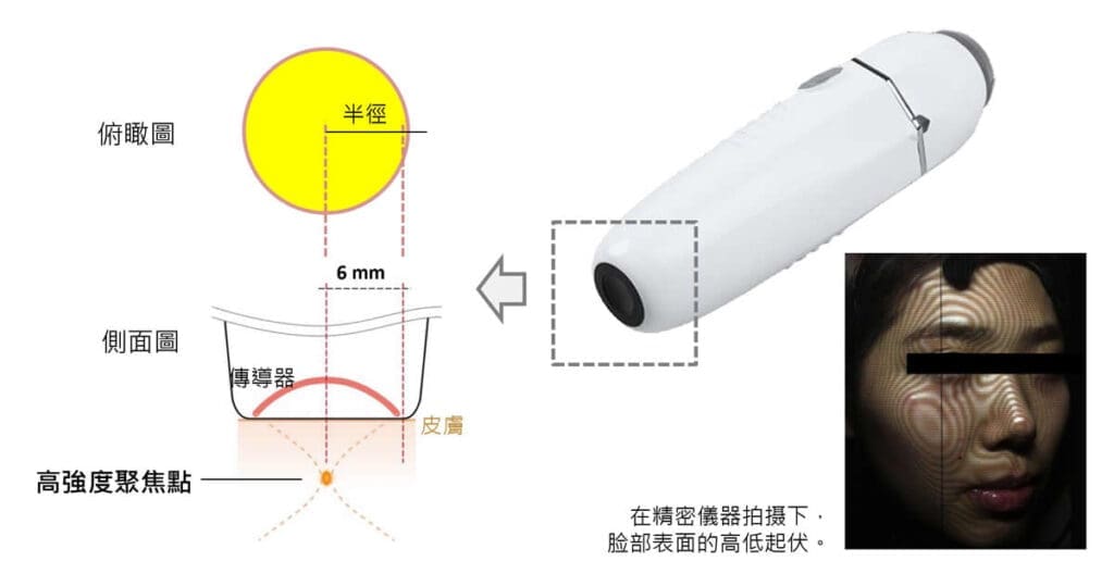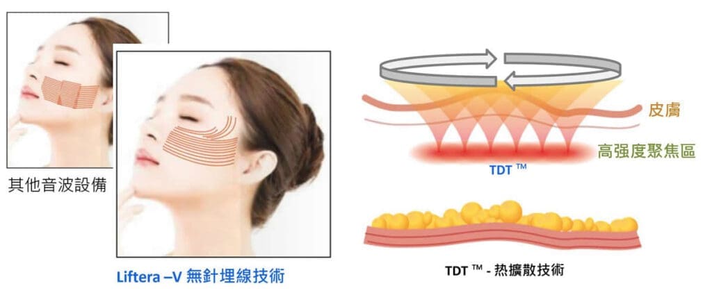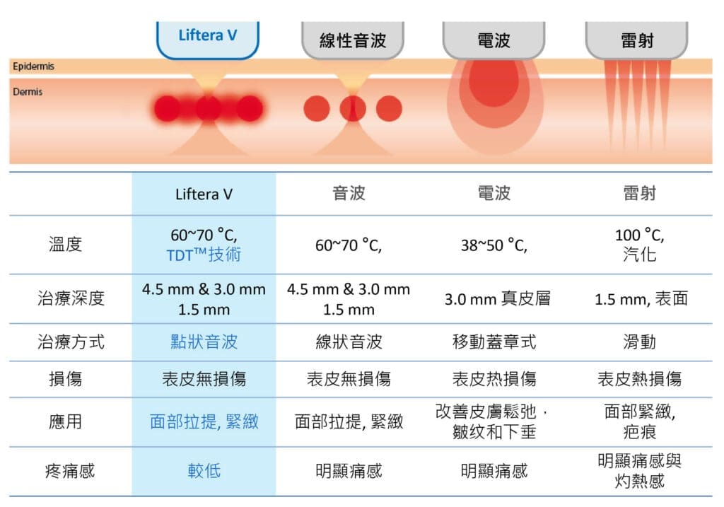 不同傳統音波系統,Liftera V 使用高強度聚焦音波,在不破壞表皮的情況下,對特定深度(4.5mm & 3.0 mm & 1.5 mm)進行拉提與膠原蛋白刺激。