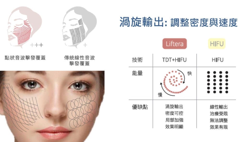 Liftera V 與傳統音波不同,可自由貼合臉部曲面滑行操作,不侷限線性治療,更容易控制能量並加強治療區域。