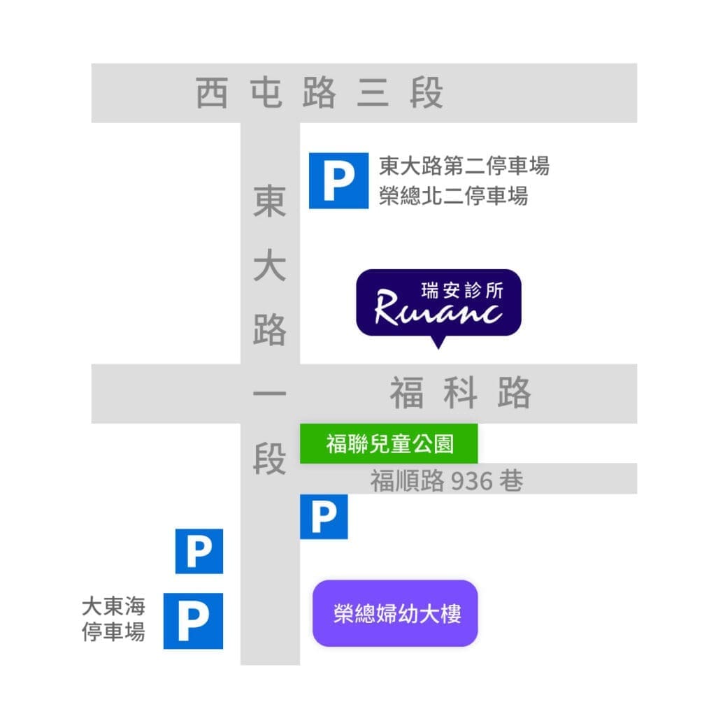 | 停車場名稱 | 地址 | 距離 | 步行到瑞安診所 |