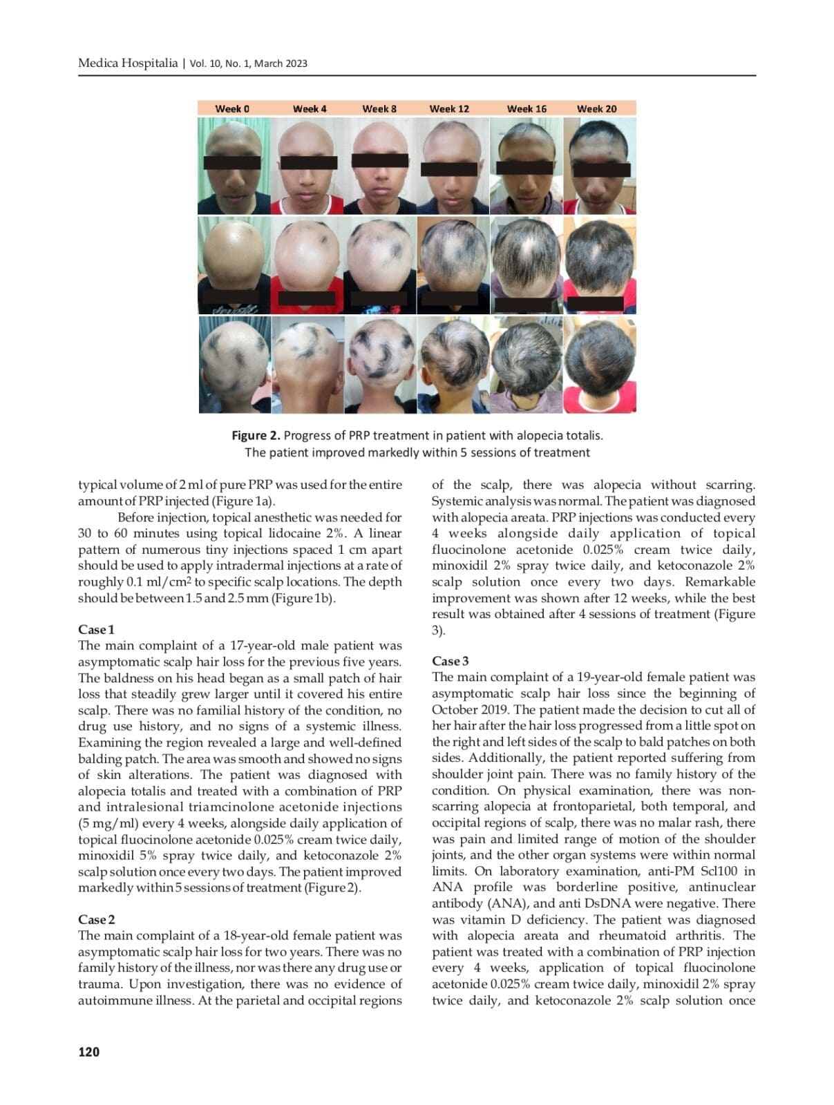 一名19歲女性患者,自2019年10月初以來主要抱怨無症狀的頭皮脫髮,並伴有肩關節疼痛。檢查發現額頂、兩側顳部和枕部無疤痕性脫髮,肩關節疼痛且活動範圍受限。實驗室檢查顯示抗PM-Scl100邊緣陽性,抗核抗體(ANA)和抗雙鏈DNA抗體(抗DsDNA)陰性,存在維生素D缺乏。患者被診斷為圓禿和類風濕性關節炎,治療方法包括每4週一次的PRP注射,並每天兩次塗抹0.025%的氟輕鬆乳膏、兩次噴灑2%的米諾地爾噴霧劑,以及每兩天一次使用2%的酮康唑頭皮溶液。此外,患者接受內科專科醫生的治療,包括口服潑尼松5 mg/12小時,環孢素25 mg/天,和鈣三醇1片/天治療類風濕性關節炎。在12週(3次治療)後,患者顯著改善。