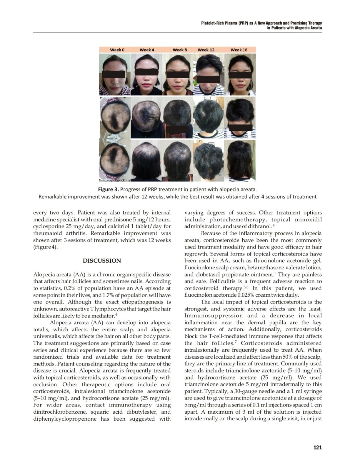 一名18歲女性患者,主要抱怨過去兩年內無症狀的頭皮脫髮。檢查發現頭皮頂部和枕部區域有無疤痕性脫髮。患者被診斷為圓禿,治療方法包括每4週一次的PRP注射,並每天兩次塗抹0.025%的氟輕鬆乳膏、兩次噴灑2%的米諾地爾噴霧劑,以及每兩天一次使用2%的酮康唑頭皮溶液。患者在12週後顯著改善,並在4次治療後達到最佳效果。