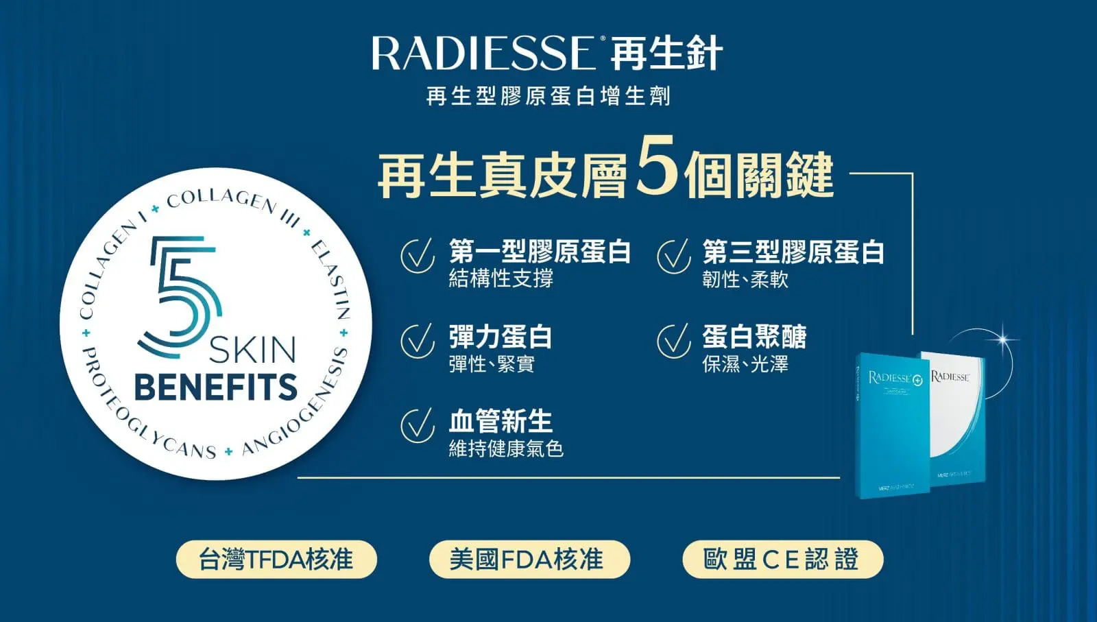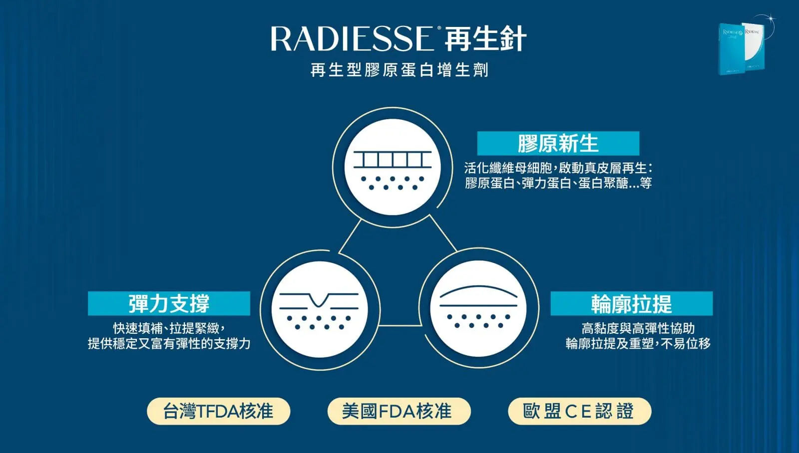 Radiesse 再生針(俗稱:再生針)是全球熱銷、獲美國 FDA、歐盟 CE 與台灣 TFDA 核可的 再生型膠原蛋白增生劑。