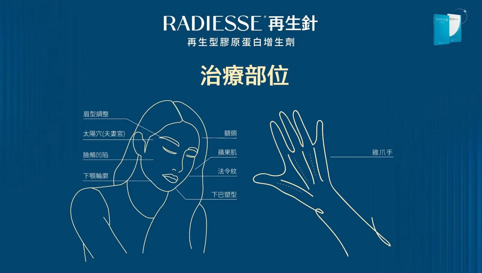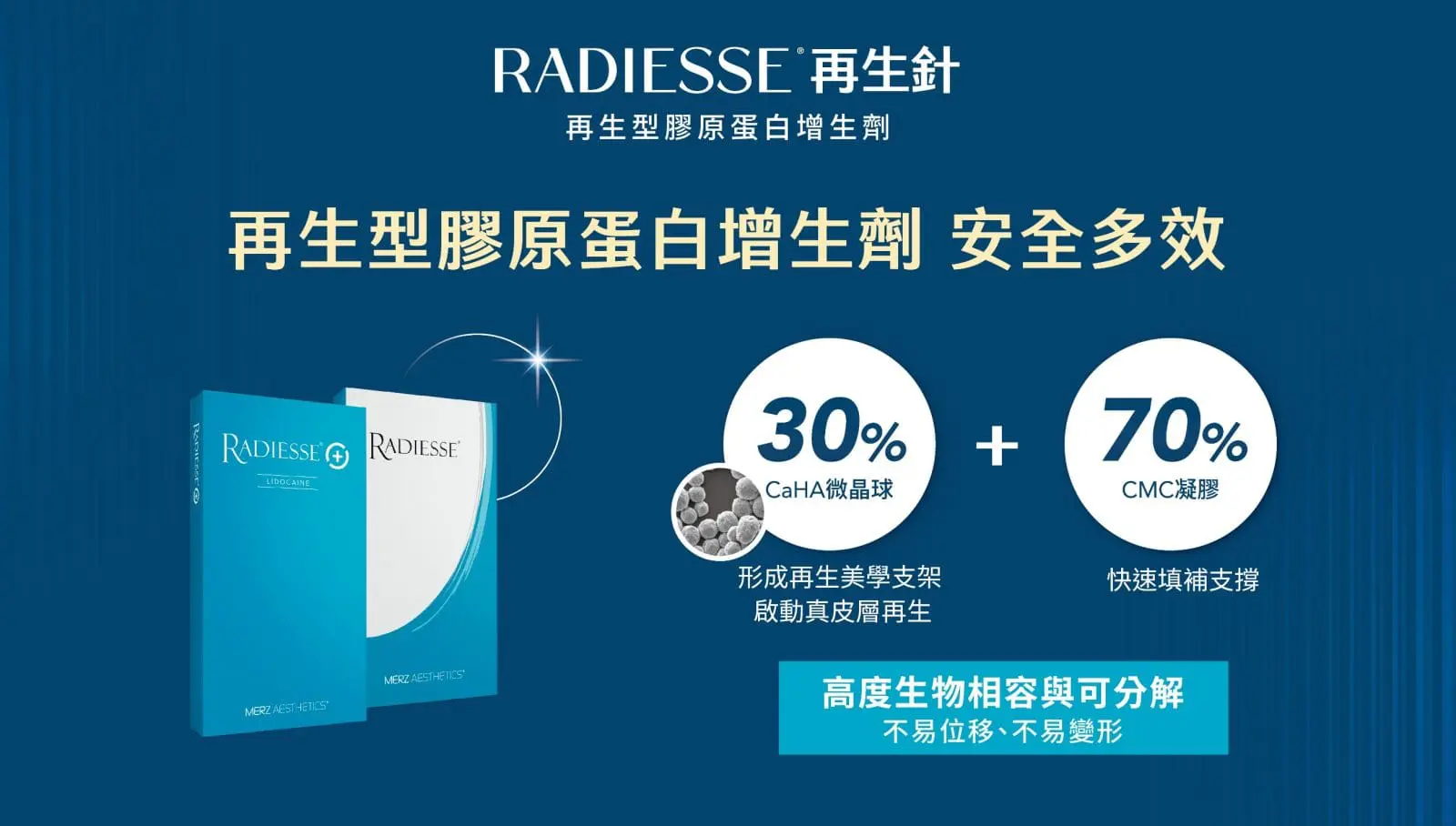 Radiesse 是再生型膠原蛋白增生劑,可立即填補凹陷,同時促進膠原蛋白、彈力蛋白及蛋白聚醣新生,達到全層次抗老。