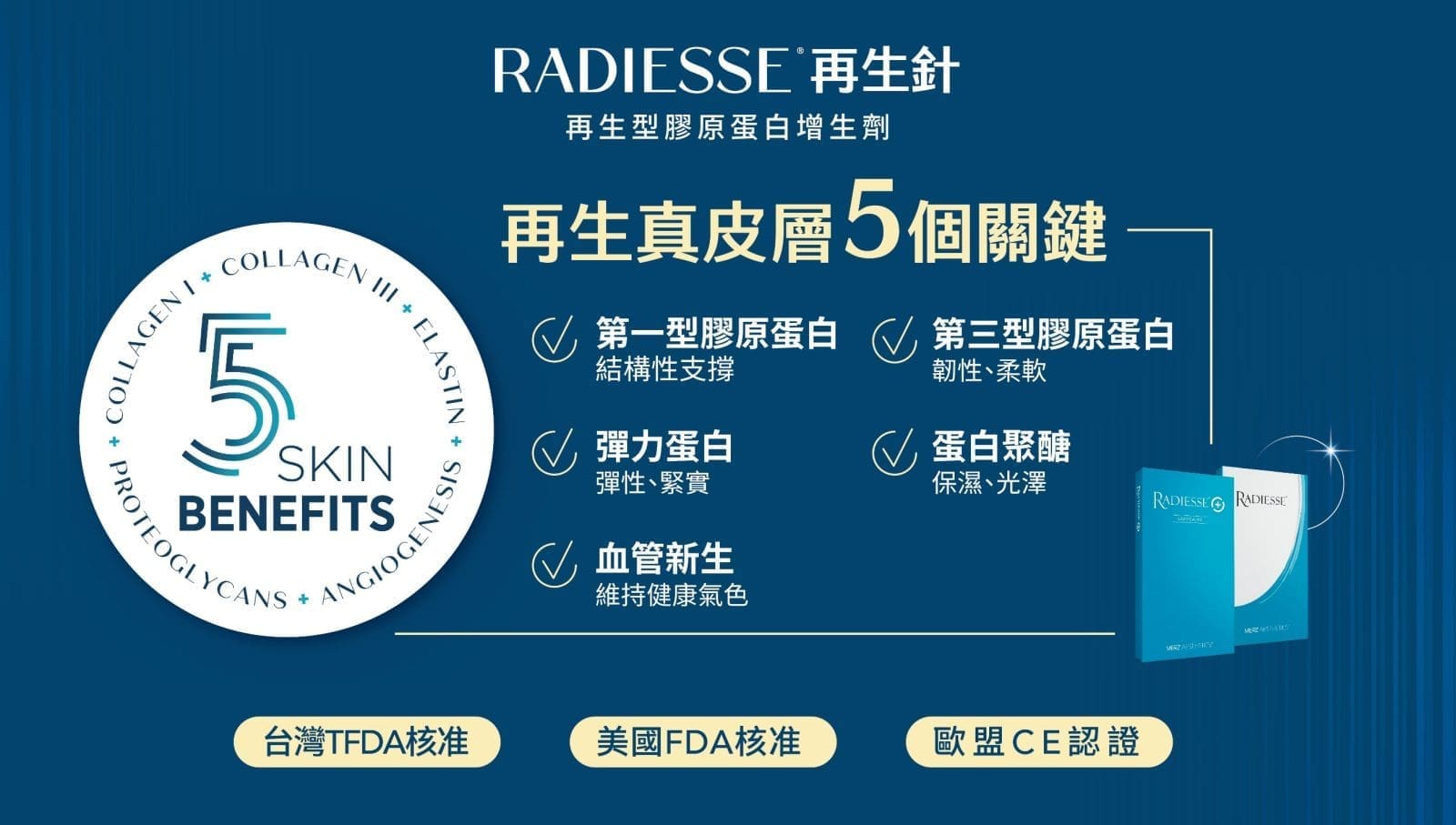 Radiesse 再生針(俗稱:再生針)是全球熱銷、獲美國 FDA、歐盟 CE 與台灣 TFDA 核可的 再生型膠原蛋白增生劑。