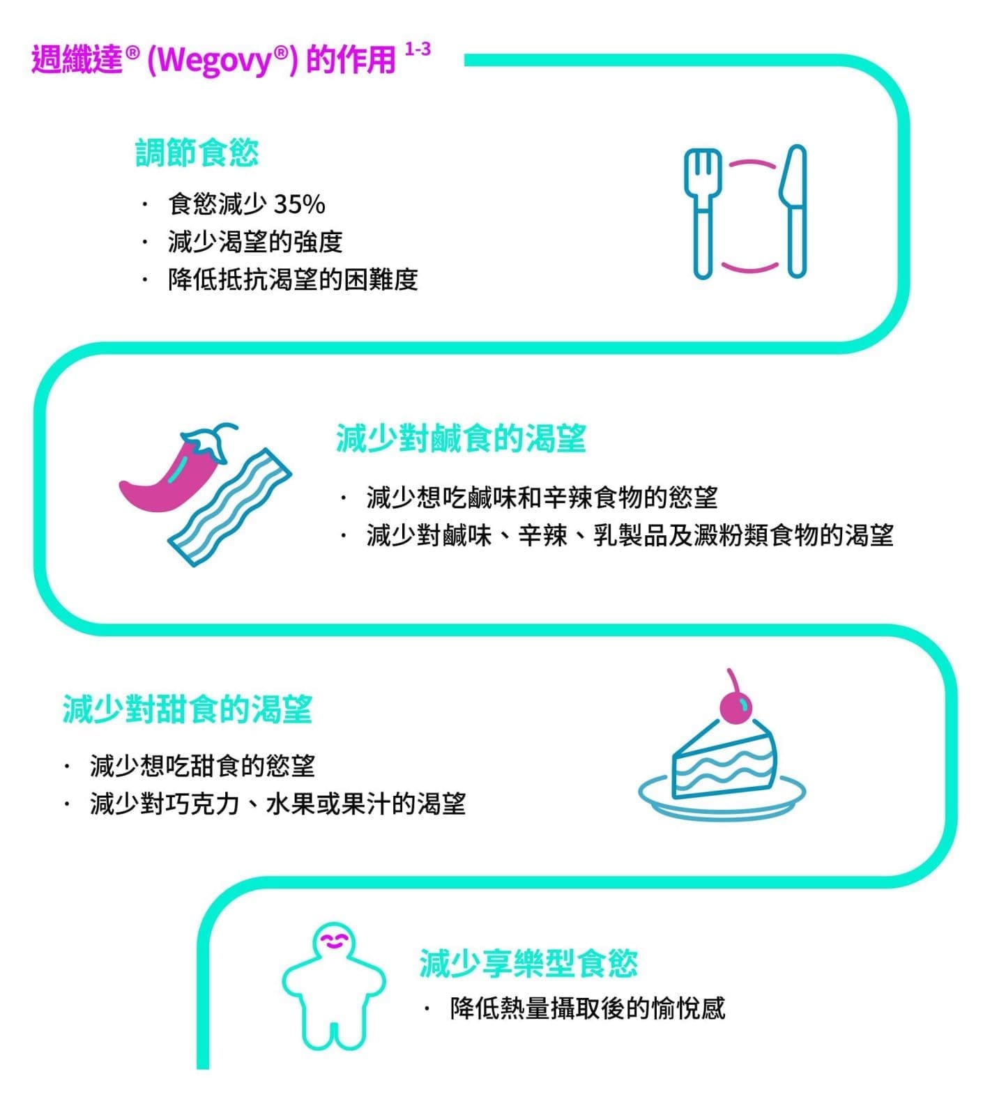 Wegovy® 週纖達模擬人體內的 腸泌素 GLP-1(Glucagon-Like Peptide-1),具以下多重作用: