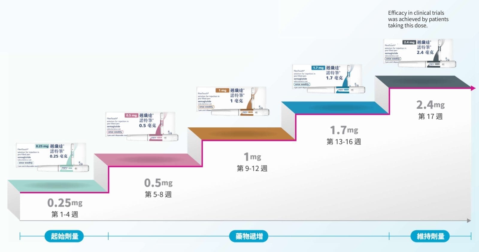 Wegovy® 以一次性筆針注射,每週施打一針。劑量需循序漸進增加,以減少副作用: